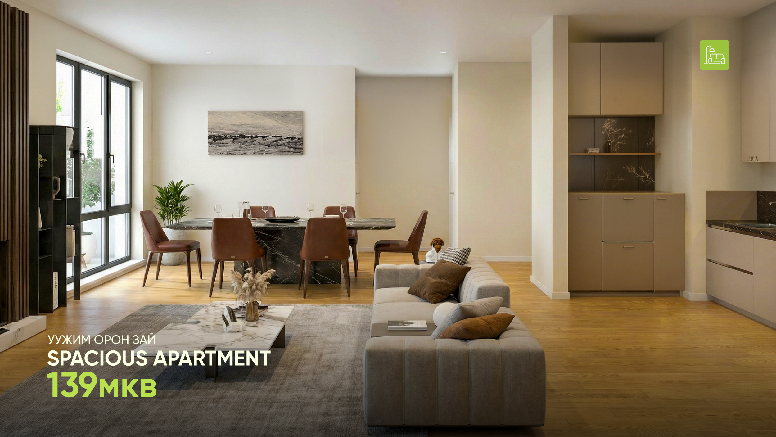 Уужим орон зай – Гэр бүл бүр өөрсдийн хэрэгцээ шаардлагадаа нийцүүлэн хэдэн өрөө, ямар зохион байгуулалттай байр сонгохоо шийддэг. Өнөр өтгөн, хувийн орон зайг чухалчилдаг өрхүүдэд тохиромжтой 4 өрөө, 139мкв хэмжээтэй орон сууц нь гурван тийш харууцтай гэдгээрээ онцлог. Байгалийн салхи нэвт салхилах, өрөө бүрд нар тусах гээд олон төрлийн давуу талтай. Дотоод зохион байгуулалтын хувьд угаалгын машин, хувцас хатаагч, цэвэрлэгээний бусад зүйлсээ хадгалах боломжтой угаалгын өрөөг тусад нь шийдэж өгсөн нь эрүүл ахуй, аюулгүй байдлын хувьд нийцтэй шийдэл юм. Түүнчлэн мастер унтлагын өрөө, дөрвөн улирал ашиглах боломжтой тагт, хувцасны өрөө зэргийг стандартын дагуу байхаар төлөвлөв.