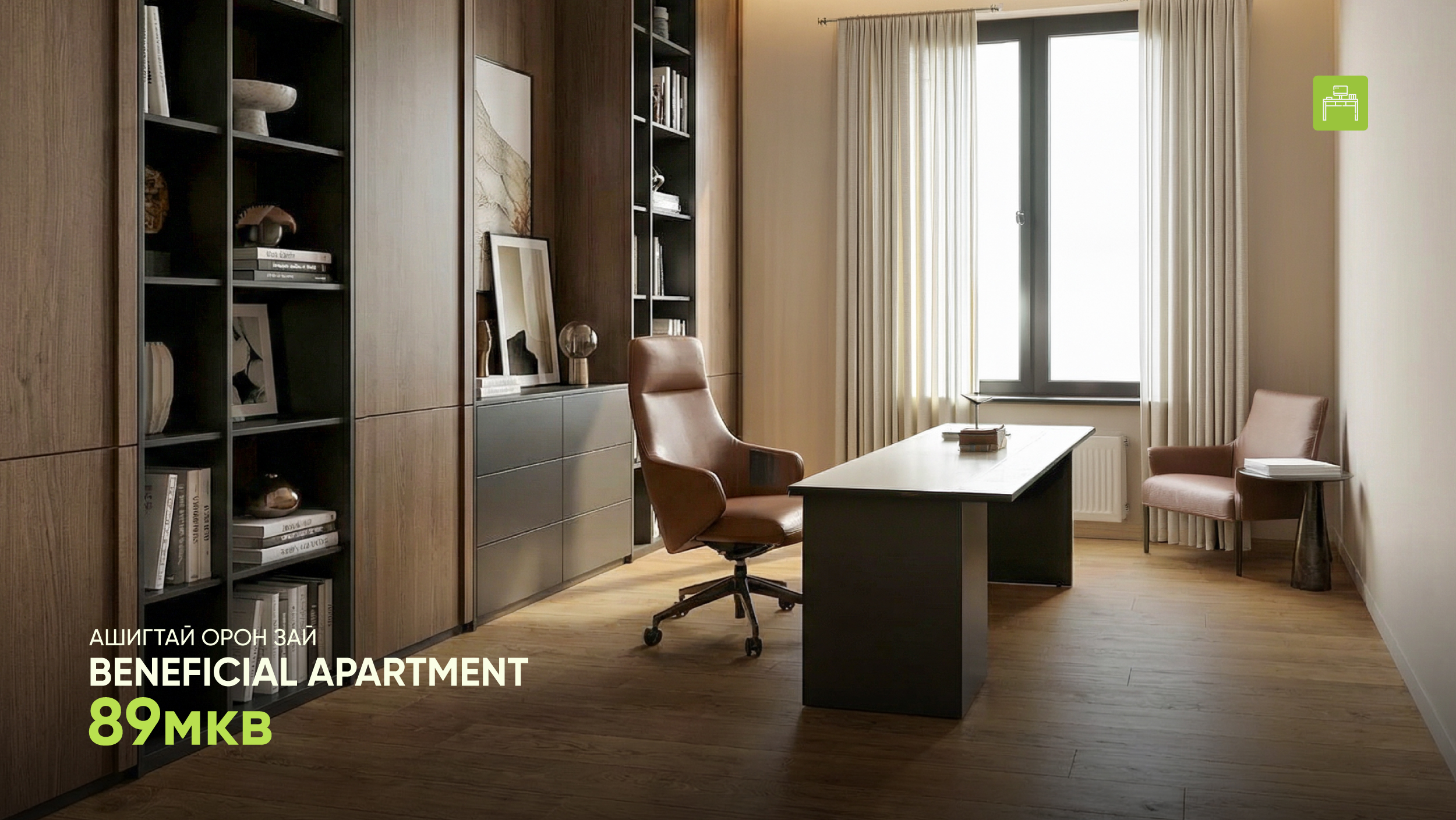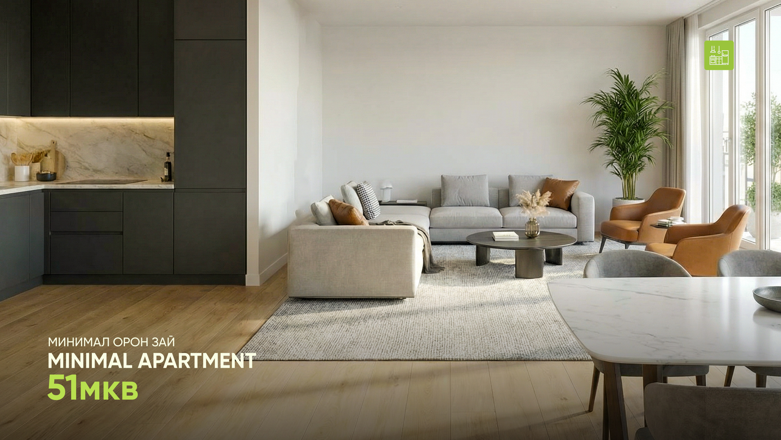Минимал орон зай – Залуу хосууд болон цэгцтэй амьдралын хэв маягт дуртай хүмүүст төгс тохирох 51мкв орон сууц нь сонгодог хэлбэрийн дотоод хуваалттай. Цэлгэр цонх, унтлагын өрөөний залгаа байх дөрвөн улирал ашиглах боломжтой тагт зэрэг нь таныг гэрийнхээ орон зайг илүү ухаалгаар тохижуулах боломжийг олгоно. Зах зээл дээр эрэлт өндөртэй байдаг энэ загварын байранд давхарын цөөн сонголт үлдэж байна.