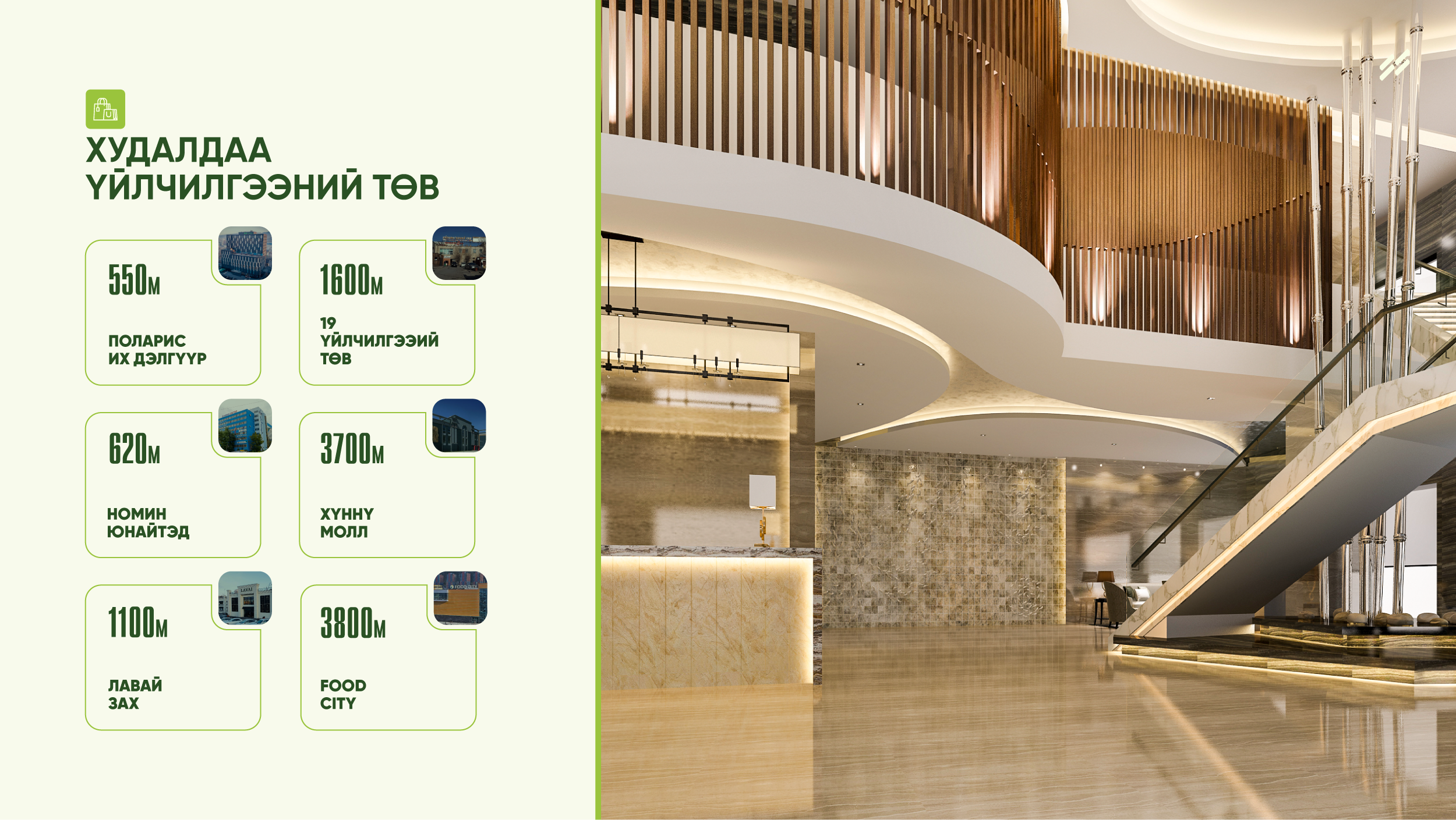 Энгийн өдөр тутмын хэрэгцээнээс авхуулаад тавилга, автомашины худалдаа гээд олон төрлийн худалдаа үйлчилгээний төвүүд хотхоны ойр орчмын 2км хүртэл зайд байрлана. Номин Юнайтед, Поларис их дэлгүүр ердөө 600м зайд байрлах бол Мишээл экспо, Шинэ сонголт зэрэг тавилгын их дэлгүүрүүд ч мөн 1км дотор зайд байрлалтай. Цаашлаад Яармагийн Хүннү Молл, Food City зэрэг 3км зайд байрших тул танд сонголт хийхэд хялбар байх болно.