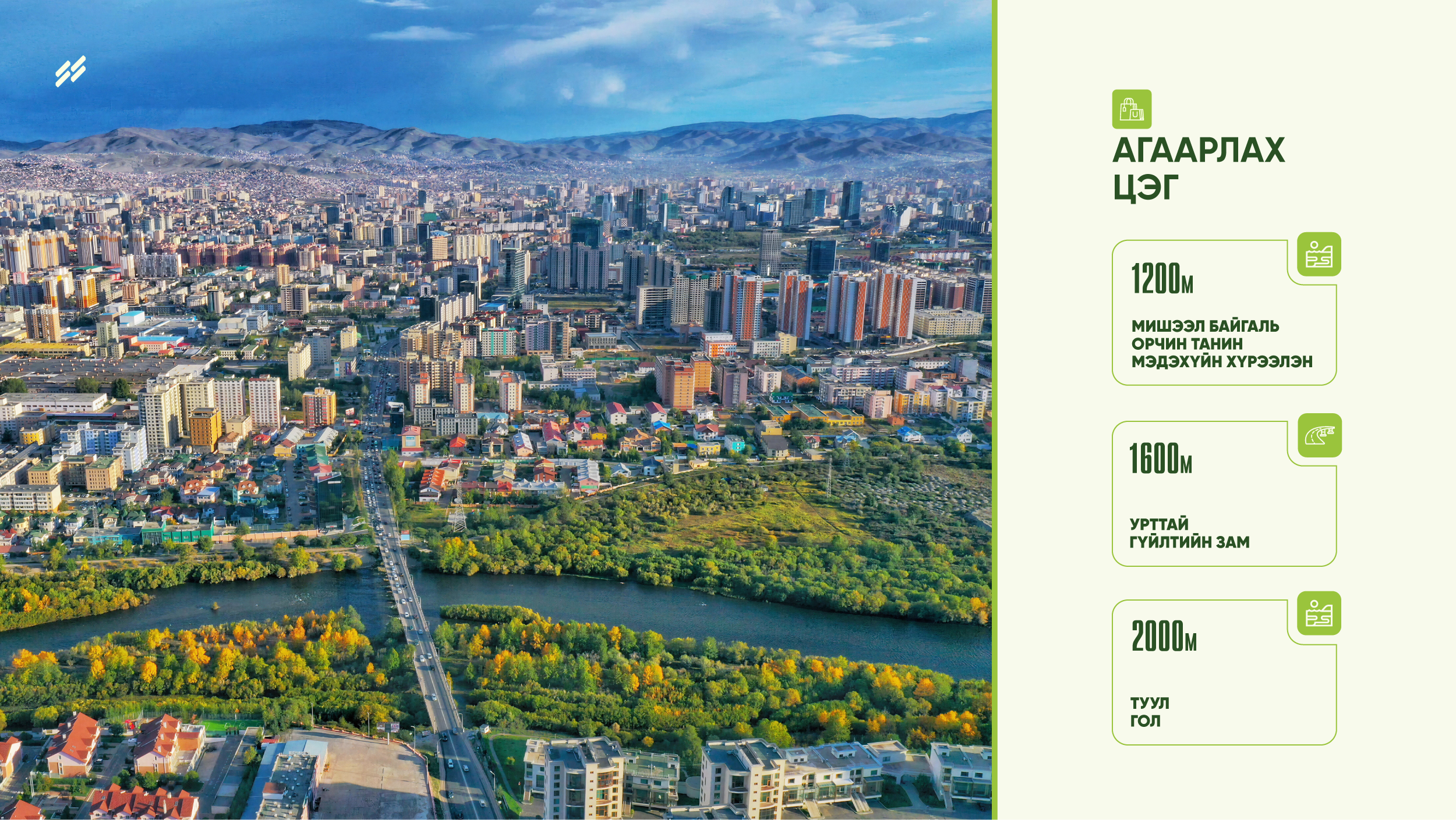 Та гэрээсээ гараад 15 минут алхах зайд Туул голын эргээр агаарлах боломжтой. Мөн энэ хэсэгт Маршалын гүүрнээс, Яармаг хүртэл холбогдсон гүйлт болон дугуйн зам байх тул дасгал хөдөлгөөн хийж, салхилан алхахад тохиромжтой юм.